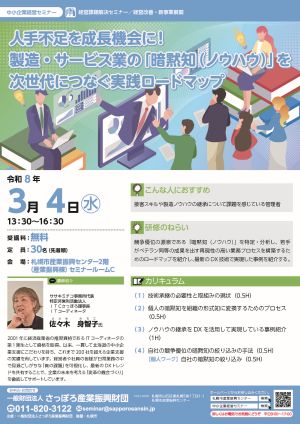| 3月4日(水曜日) | 15時〜16時30分 | (1)技術承継の必要性と取組みの現状 (0.5H) (2)個人の暗黙知を組織の形式知に変換するためのプロセス (0.5H) (3)ノウハウの継承をDXを活用して実現している事例紹介 (1H) (4)自社の競争優位の暗黙知の絞り込みの手法 (0.5H) (個人ワーク)自社の暗黙知の絞り込み (0.5H) | ササキミチコ事務所 代表 佐々木 身智子 |
