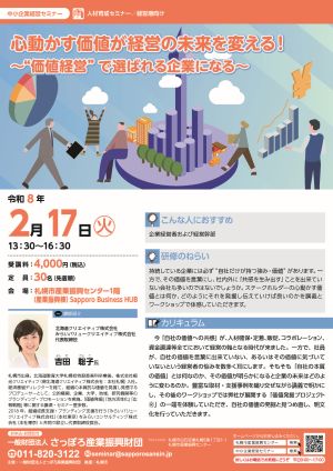 | 2月17日(火曜日) | 13時30分〜16時30分 | 今「自社の価値への共感」が、人材確保・定着、販促、コラボレーション、資金調達等全てにおいて経営の軸となる時代が来ました。一方で、社員さんが、自社の価値を言葉に出来ていない、あるいはその価値に気づいていないという経営者の悩みを数多く耳にします。そもそも「自社の本質の価値」とは何なのか、その価値が明らかになると企業の未来はどのように変わるのか。豊富な取材・支援事例を織り交ぜながら講義で明かにし、その後のワークショップでは弊社が展開する「価値発掘プロジェクト®️」の一端を体験していただき、自社の価値の発掘と見つめ直し、明文化を行っていただきます。 | 北海道クリエイティブ株式会社 みらいバリュークリエイティブ株式会社 代表取締役 吉田聡子 |