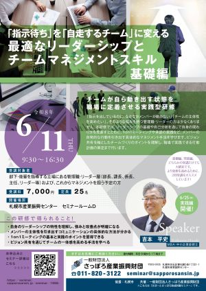 | 6月11日(木曜日) | 9時30分〜16時30分 | 1.リーダーの役割と仕事管理の基本理解 リーダーに求められる役割と成果につながる仕事の進め方を整理します。 2.業務改善の視点と優先順位の考え方 業務が滞る要因を整理し、改善の進め方を学びます。 3.チームを動かす基本コミュニケーション 報告・連絡・相談と情報共有の重要性を確認します。 4.人を育てる関わり方(コーチング基礎) 自発的成長を促す基本スキルを体験的に学びます。 5.1on1ミーティングの基礎理解 面談の目的と進め方を理解します。 6.実践に向けた行動計画の整理 職場で試す具体的行動を明確にします。 | 人とデザイン研究所合同会社 代表社員 MBA・中小企業診断士 吉本 平史 |