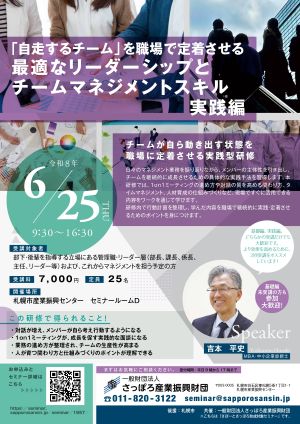 | 6月25日(木曜日) | 9時30分〜16時30分 | 1.チーム運営(日常ミーティングの実践) 日常のミーティングを通じたチーム運営を実践します。 2.タイムマネジメントの運用 業務効率化につながる具体的な進め方を整理します。 3.対話力を高めるコミュニケーション実践 傾傾聴・質問を用いた関係構築をトレーニングします。 4.1on1ミーティングの継続実践 育成につながる面談を実践形式で確認します。 5.人材育成が続く仕組みづくり 継続的に人が育つ環境づくりを設計します。 6.職場定着に向けたアクション共有 実行計画を作成し共有します。 | 人とデザイン研究所合同会社 代表社員 MBA・中小企業診断士 吉本 平史 |